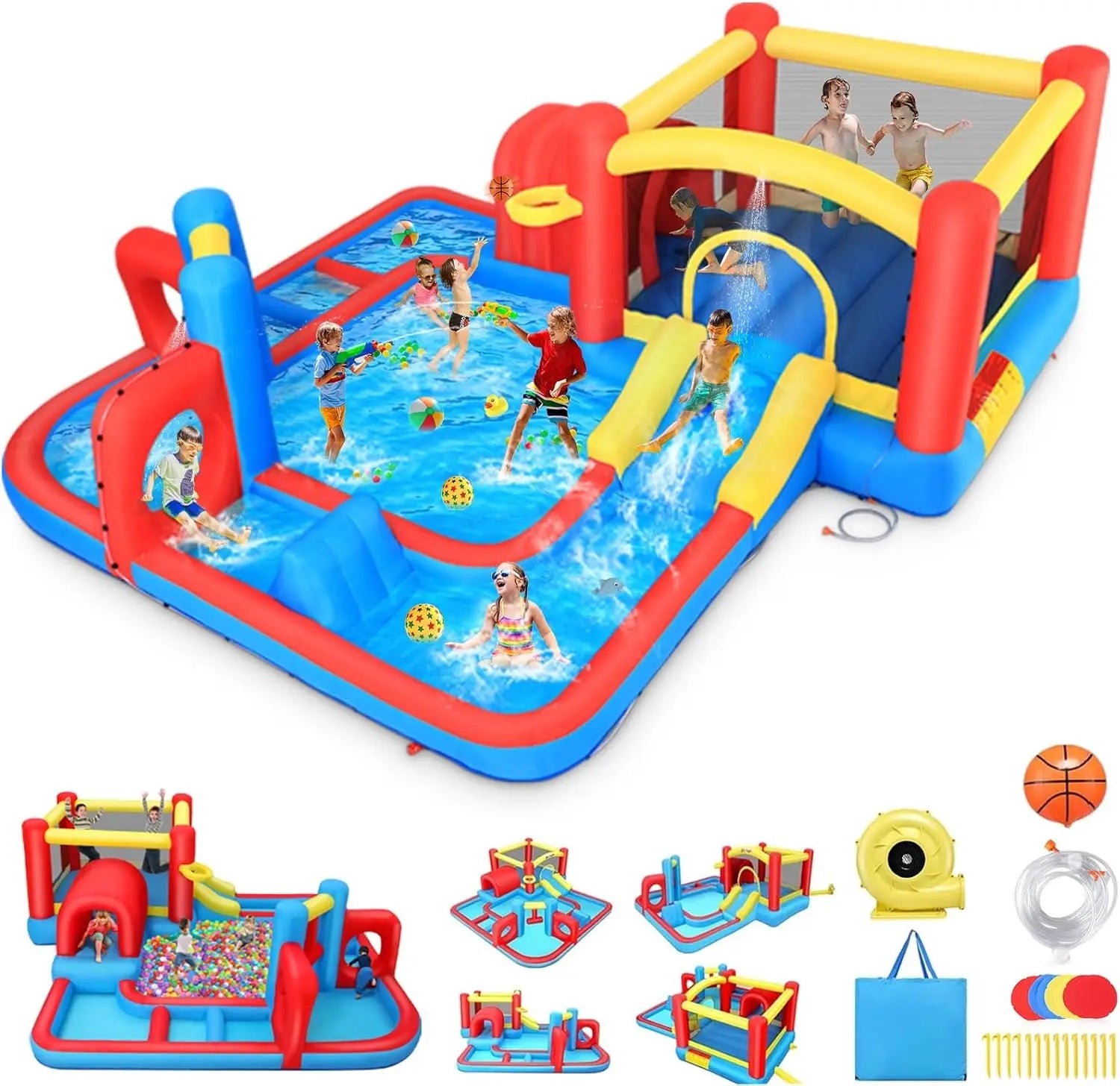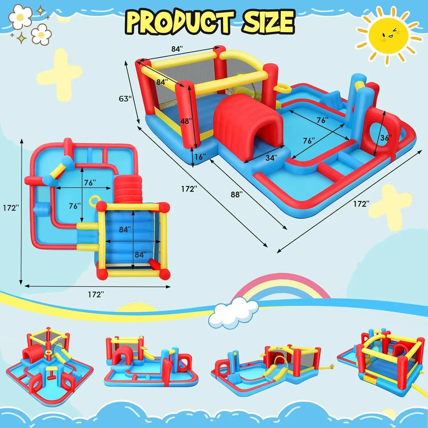 Bounce House Waterslide for Kids 3-12 w/Blower, 14.3 x 14.3FT Inflatable Obstacle Course w/Jump Area, Divided Ball Pit, Slide, O