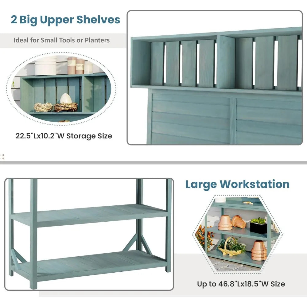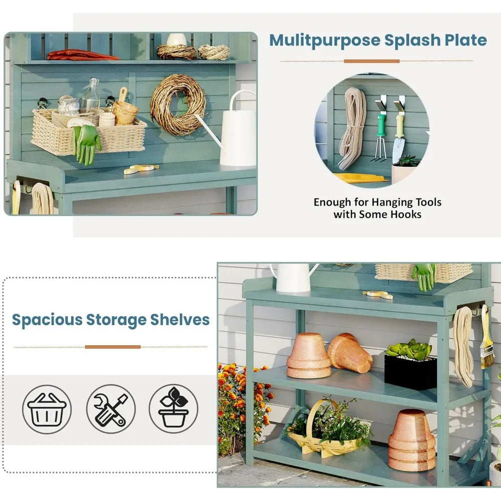 Large Wooden Farmhouse Rustic Outdoor Patio Workstation Potting Bench Table with 4 Storage Shelves and Side Hook - Green