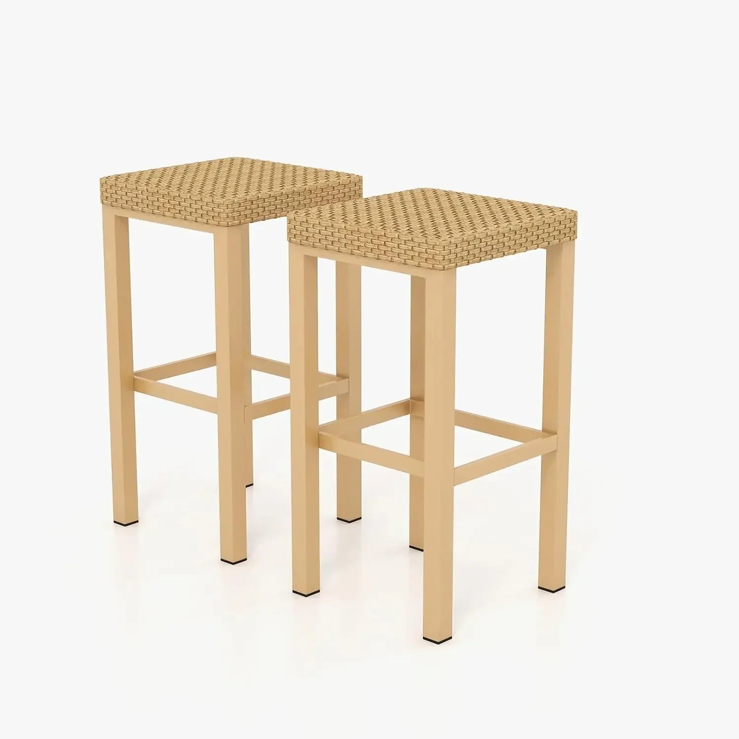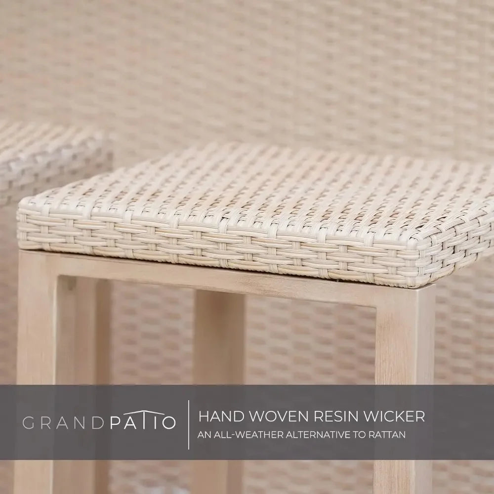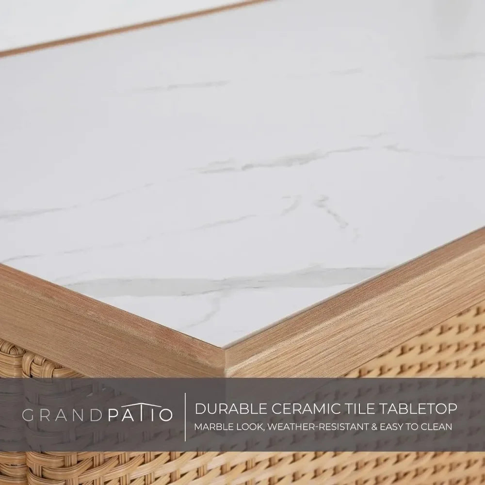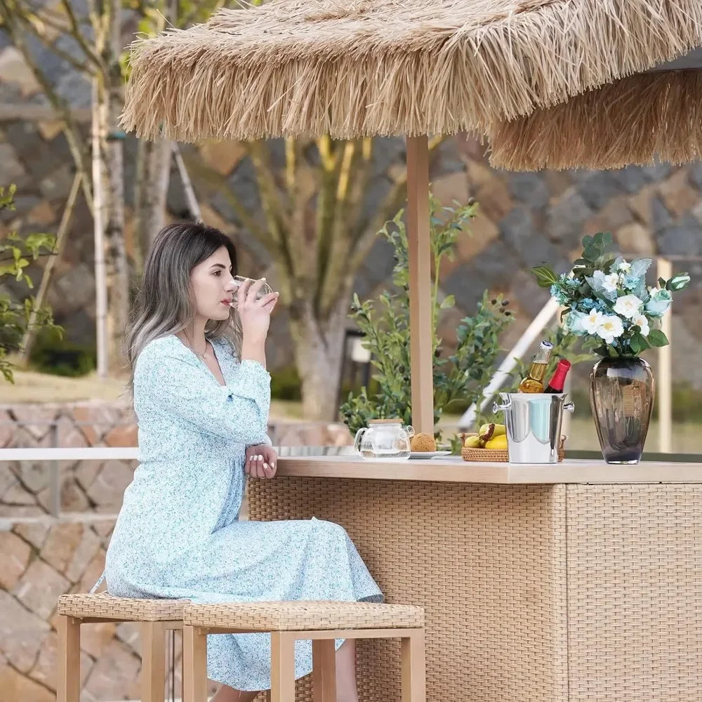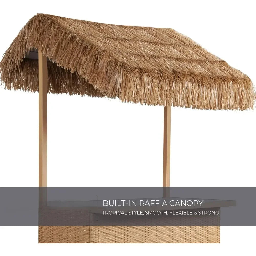 Outdoor All Weather Resin Patio Wicker Steel Islander Tiki Bar & 2 Stools w/ Ceramic Top & Storage for Garden Party, Natural