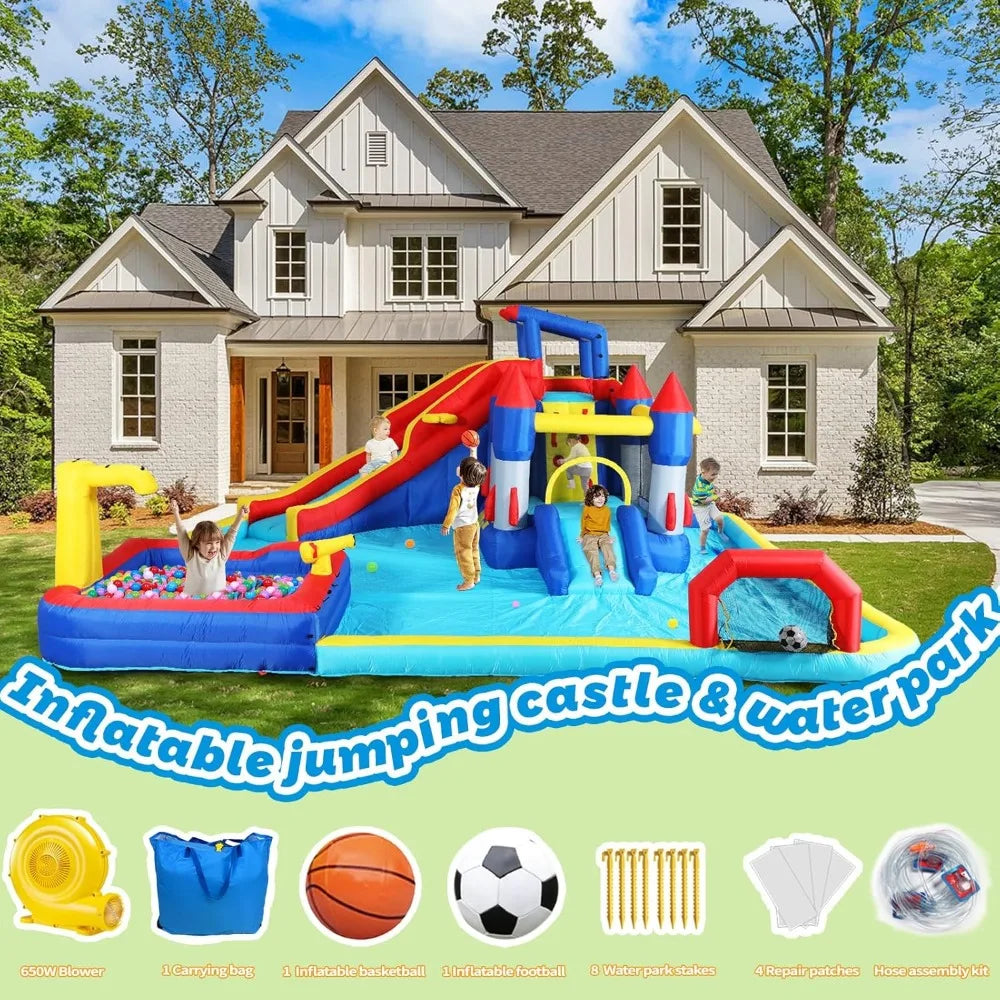 Outdoor Inflatable Water Slide, Water Park Bounce House with 650W Blower, Dual Splash Pool, Water Cannon, Basketball & Soccer